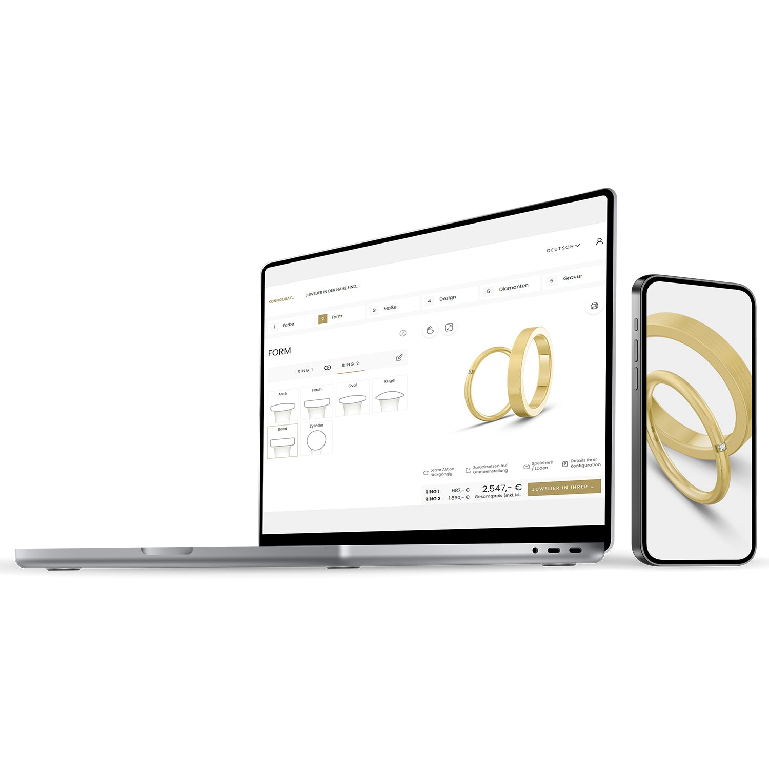 Mit dem Eheringkonfigurator gestalten Sie Eheringe gemeinsam mit Ihren Kunden in Echtzeit. Das digitale Tool unterstützt Sie im Beratungsgespräch und macht individuelle Designs sofort erlebbar – für höhere Abschlussquoten und begeisterte Kunden.